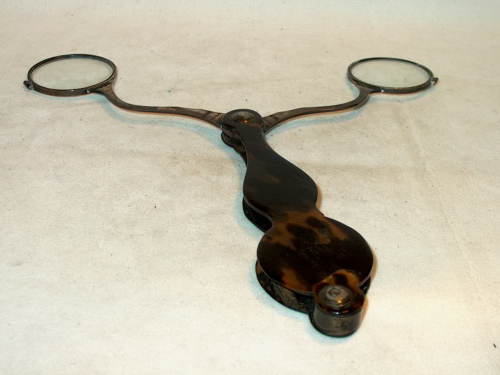 Fassamano a forbice con impugnatura in tartaruga e occhiale in argento. L'astuccio-impugnatura funge da custodia quando l'occhiale non viene usato, i supporti sono ondulati e la sua forma segue esattamente quella dell'occhiale quando è chiuso. [Descrizione estratta dal database del Museo dell'Occhiale.]