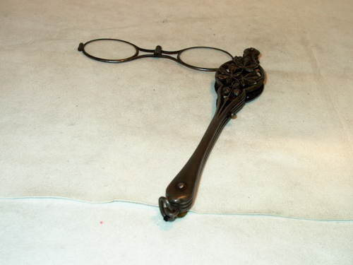 Fassamano in acciaio e reca le due facce che proteggono le lenti ovali con motivi di bacche e foglie. Le lenti si possono ripiegare all'interno dell'astuccio. [Descrizione estratta dal database del Museo dell'Occhiale.]