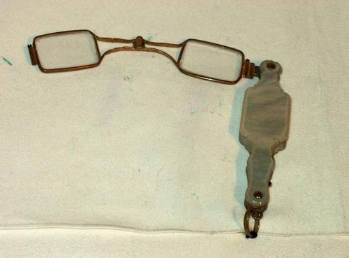 Fassamano in ottone a ciondolo, astuccio-impugnatura in madreperla di forma ovale allungata. [Descrizione ricavata dalle schede cartacee del Museo dell'Occhiale.]
