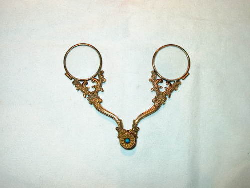 Fassamano a forbice detto del tipo "Incroyables". I due lembi, che servono anche da impugnatura, sviluppano motivi floreali incisi e sbalzati. La cerniera a perno è decorata con un rosoncino cesellato a fiore, nel quale è posto, su ambedue i lati, un bottone di turchese. [Descrizione tratta dalla scheda cartacea del Museo dell'Occhiale.]