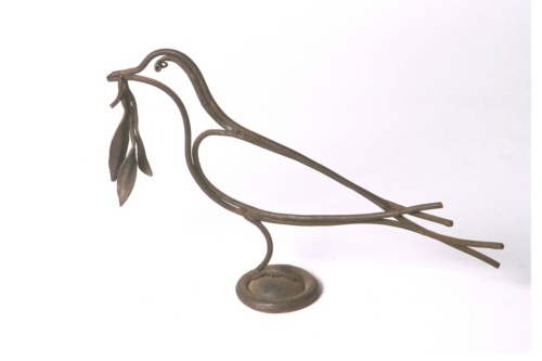 Uccellino stilizzato in ferro battuto con applicato nel becco un ramoscello di ulivo, poggia su base rotonda.