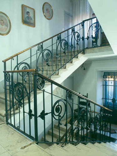Rampa di scala interna all'edificio che ne collega i tre piani. È composta da una struttura modulare che si ripete. Il modulo è formato da sei barre in ferro quadro diposte verticalmente e due barre disposte orizzontalmente. Dalla prima barra a sinistra si diparte una barra piegata a caldo a formare un elemento decorativo a girale. Due elementi a girali di più ridotte dimensioni decorano la fascia superiore del modulo. Elementi a foglia ribattuta servono da collegamento tra le barre verticali.