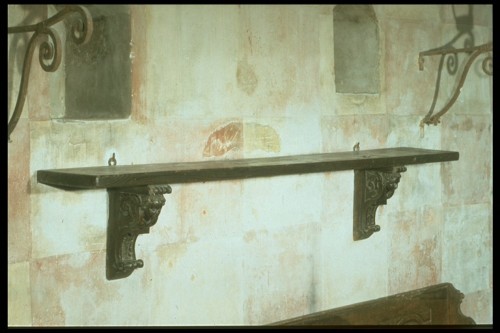 - NOTIZIE STORICO CRITICHE Le due mensole hanno provenienza antiquariale. Il piano è stato realizzato ed aggiunto dal conservatore del castello, sig. Adolfo Cattin, negli anni dell'iniziativa del conte Cini di arredare l'ambiente.