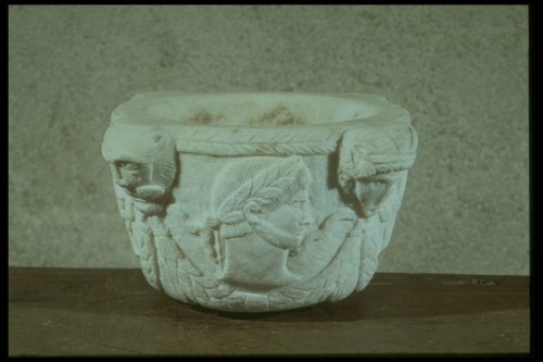 Bocca circolare. Impugnature zoomorfe raffiguranti teste di leoni e di arieti. Coppa decorata ad altorilievo con teste in profilo di Cesari. Fusto breve decorato con festoni.
