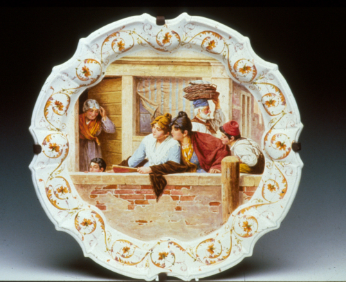 grande piatto rotondo da parata con tesa a coste; decoro policromo