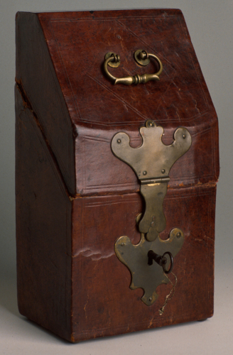forchetta con manico in maiolica decorato in policromia, inserita in cofanetto di pelle
