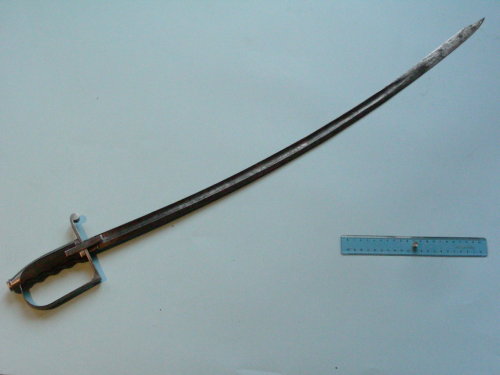 lama fuori ordinanza, curva, a filo, punta e controfilo. Ampie sgusciature sui due lati, per i primi tre quarti; per l'ultimo quarto, liscia per la lunghezza del controfilo. Punta ribassata alla pandura. Fregi ad acido a motivi militari e floreali su entrambi i lati della lama per la prima metà; motivo floreale anche sul dorso. Guardia a staffa ad un solo ramo; ramo di parata a riccio con spacco per dragona; alette fermafodero rettangolari; cappetta lunga con dorso sfaccettato. Tipico bottone ottagonale avvitato al codolo. Impugnatura zigrinata e sagomata.