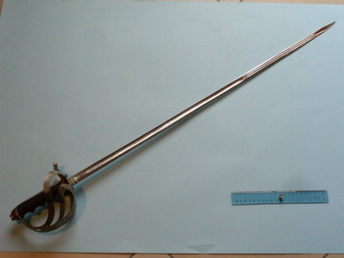 Lama cromata dritta a filo, punta e controfilo; sgusciatura sui due lati per i primi tre quarti; per l'ultimo quarto doppio sguscio con punta ribassata alla pandura. Incisa ad acido per metà a motivi militari e floreali. Fornimento tipico con guardia e due elsi. Corto ramo di parata a riccio con conchiglia per il pollice. Cappetta lunga, arrotondata, con dorso zigrinato nell'ultimo quarto. Bottone piatto, ovale, avvitato al codolo. Impugnatura anatomica. Rivestimento al tallone.