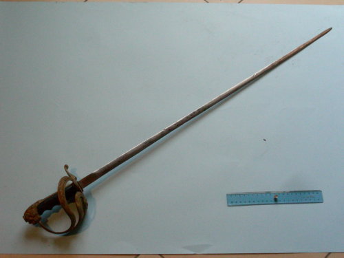 Lama dritta a filo, punta e controfilo; a sezione romboidale senza sgusci; punta al centro. Incisa ad acido per metà a motivi militari e floreali. Fornimento in ottone dorato con guardia e due elsi di piccolo spessore decorati con fogliami a bassorilievo. Corto ramo di parata a riccio appena accennato con conchiglia per il pollice sul piatto di guardia. Cappetta lunga, a testa di leone con corta criniera. Bottone piatto, ovale, avvitato al codolo. Impugnatura anatomica. Rivestimento al tallone.