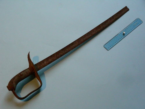 lama leggermente curva, con un solo sguscio su entrambi i lati. Guardia mobile. Ramo di parata con doppio spacco per dragona, decorato nella parte inferiore. Cappetta lunga alla guardia, squadrata. Bottone ottagonale avvitato al codolo. Impugnatura a settori.