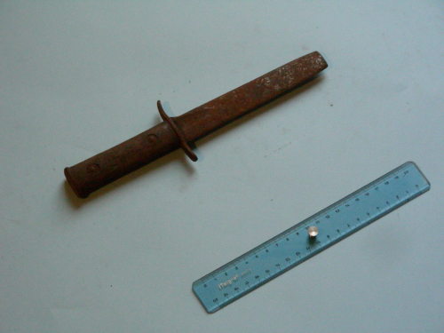 Lama dritta, ricavata dalla punta di baionetta Vetterli. Guardia stretta, piegata in avanti. Impugnatura a due guancette fermate con due spinotti centrali e cappetta a rondella, ovalizzata.