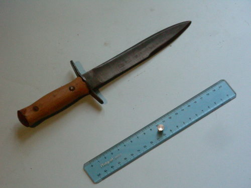 Lama dritta ad un filo e mezzo, piatta. Punta simmetrica al centro. Il manico è composto da due guancette appena sagomate a sezione semicircolare fissate da due spinotti con rosette e chiuse superiormente da una piccola calotta bombata; la guardia è piatta, con le estremità leggermente inclinate verso la lama.