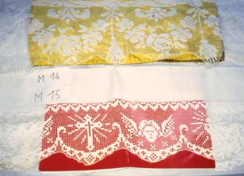 Bordura a filet con ricamo a punto tela. Ricamo con filo di cotone rosso.