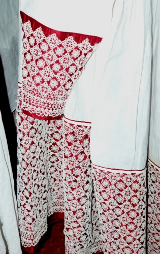 Chiacchierino in cotone bianco. Sullo scollo merletto a fuselli e chiusura con elementi dorati. Sul carrè di raso rosa quattro "soli" per parte di tipo catalano. Supporto di gros rosso.