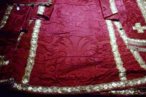 Per poter essere adoperato come "unicum" è stato unificato dalla stessa tipologia di galloni settecenteschi. Damasco rosso, fodere di diverse tipologie di taffetà. Nel velo da calice il merletto è utilizzato al rovescio; nella stola il damasco veneziano è del XV sec.; nel manipolo è presente un frammento di damsaco più tardo.