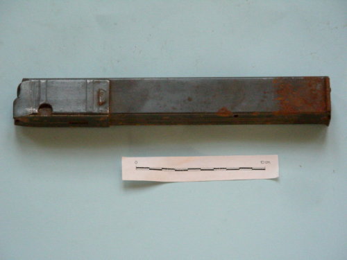 A parallelepipedo, con scanalature laterali; meccanismo a molla ed incastro per il fucile mitragliatore.