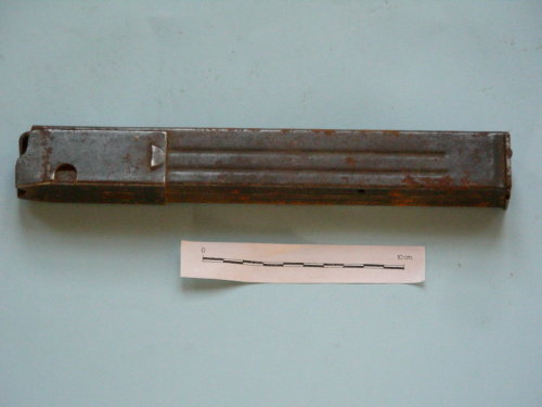A parallelepipedo, con scanalature laterali; meccanismo a molla ed incastro per il fucile mitragliatore.