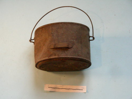 Manico in tondino inserito in due occhielli laterali saldati. Placca di aggancio sul corpo della gamella.