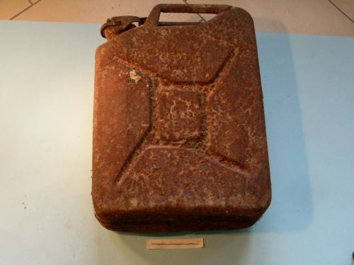 In lamiera; chiusura ermetica e impugnatura a tre bande cilindriche sulla parte superiore; scanalature sulle due facce laterali del fusto.