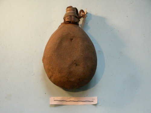 Tappo a vite fissato al corpo con cinturino e moschettone; telino chiuso da quattro bottoni; cinturino di fissaggio attorno al collo.