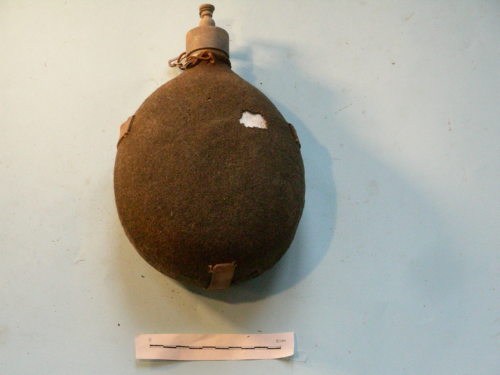 Tappo a vite zigrinato fissato al corpo con catenella metallica, con foro e tappino all'apice; telino grigio-verde cucito, con tre passanti ai lati e all'estremità inferiore.