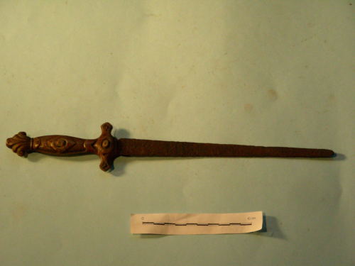 Lama dritta, a doppio filo, con sezione a losanga e punta arrotondata; impugnatura decorata a rilievo con motivi geometrici.