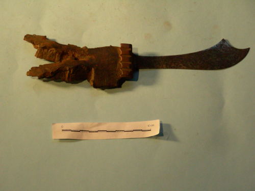 Lama ricurva a forma di scimitarra, a doppia punta. Filo unico. Impugnatura non lavorata, in conformazione di scheggia, con paramano ricavato da fascia di forzamento di granata.