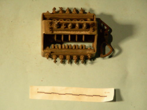 Corpo principale vuoto con tre barre di metallo su cui sono applicati cinque contatti ciascuna. Barra centrale scanalata azionabile tramite vite, per spostare cinque listelle metalliche ricurve per congiungere i vari contatti.