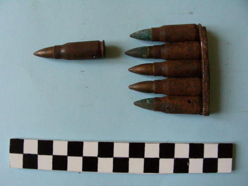 Di forma cilindrica, con fondello e restringimento all'apice del bossolo e proiettile conico. Le sei cartucce conservano una piastrina metallica.