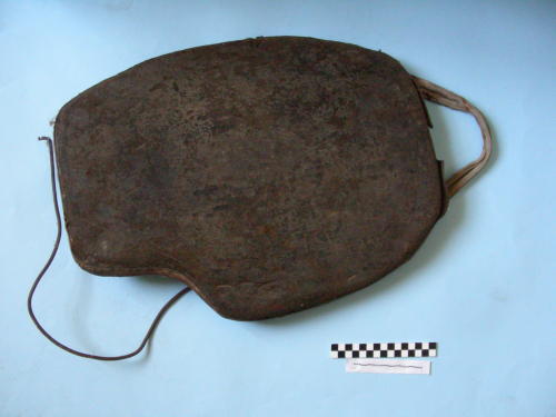Di forma ovale, con rientranza sul lato destro superiore, leggermente convessa. Due cinghie incrociate fissate alla parte posteriore, a formare maniglie di trasporto; maniglia metallica modellata fissata lateralmente mediante due magliette. Ulteriore maniglia di trasporto nella parte superiore.