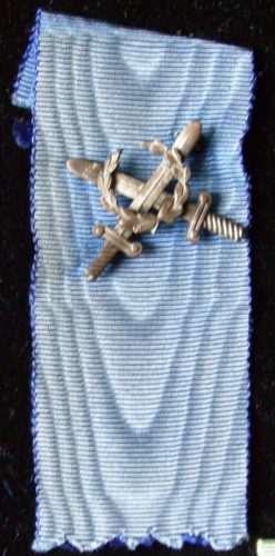 distintivo a spillo in metallo argentato; consiste in due gladi incrociati ai quali sono sovrapposti due rami di alloro che si congiungono in basso. L'insegna è sostenuta da un nastro di seta turchino/celeste, come quello per la Croce di Guerra al Valor Militare in bronzo.