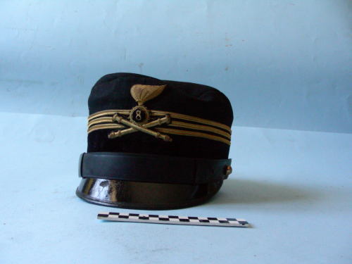 Di forma circolare con visiera prominente e sottogola a cinturino regolabile fissato alle tempie con due bottoni e posizionato sopra la visiera; fregio con stemma dell'artiglieria in posizione frontale sovrapposto a tripla banda color oro. Ulteriori tre fili dorati verticali terminanti sulla calotta. Interno foderato di colore viola.