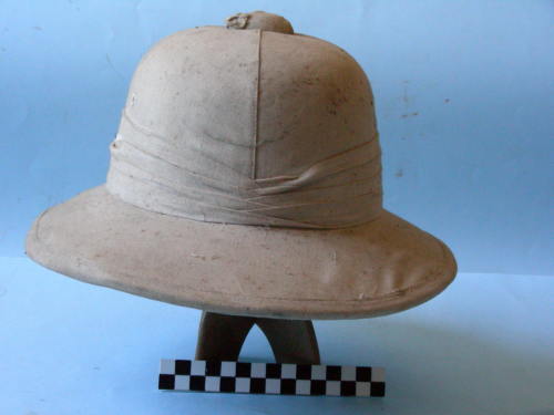 Calotta a quattro sezioni sormontata da calottino in lamiera rivestita con tre fori di aerazione; tesa larga; quattro fori di aerazione laterale. Fascia posta sopra la tesa, cucita. Rivestimento interno della tesa color verde.