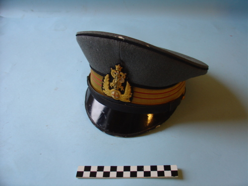 Con visiera prominente e sottogola a cinturino regolabile fissato alle tempie con due bottoni e posizionato sopra la visiera; fregio con stemma della Sanità in posizione frontale sovrapposto a striscia color e rosso. Interno foderato di colore bianco. Parte superiore larga, semirigida, sagomata, di colore grigio-verde.
