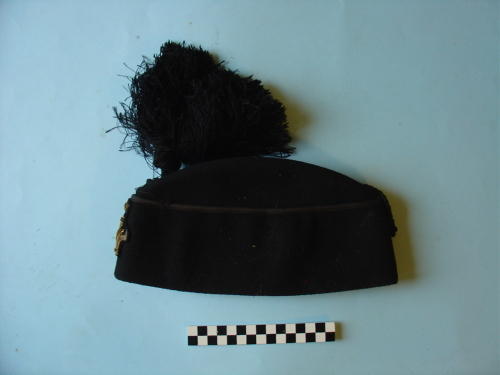 Floscia, con risvolto ripiegato all'esterno, bordato. Leggera curvatura al centro del cupolino, in senso longitudinale. Colore nero; fregio frontale. Cordoncino doppio, intercciato, terminante con fiocco di colore nero in posizione anteriore, fissato sulla curvatura del cupolino e sul lato destro. Etichetta applicata al bordo interno.