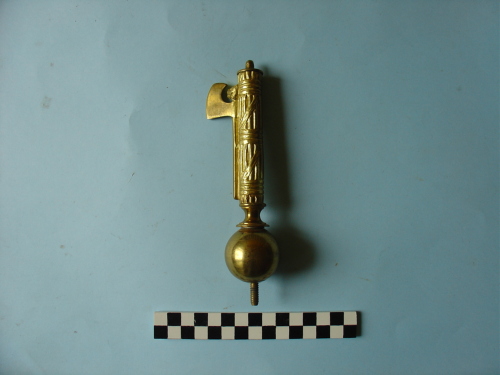 fascio littorio di secondo tipo, con scure laterale e testina di leone, in fusione a tutto tondo. Conserva nella parte inferiore una sfera; più sotto una vite in ferro.