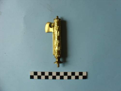 fascio littorio di secondo tipo, con scure laterale e testina di leone, in fusione a tutto tondo. Conserva nella parte inferiore una vite.
