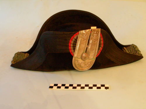 Corpo rigido rivestito di castorino, guarnito di nastro cordonato di seta nera sulle due tese ripiegate, fascia argentata sul bordo interno inferiore con due ulteriori fascie argentate sui corni, terminanti con 6 nappe il canottiglia argentata, cappietto frontale a forma di "u" decorato ad incisione con motivi floreali e militari e fermato con bottone decorato su coccarda tricolore. Interno foderato di carta di colore rosso fermata al centro da etichetta.