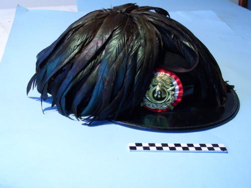 A cupola bombata e tesa larga con fascia risalente sulla cupola e tasca porta piumetto. Fregio frontale. Quattro fori sulla cupola e piumetto inserito. Interno sfoderato con due passanti metallici ai lati ed ulteriore passante a forma di losanga al centro.