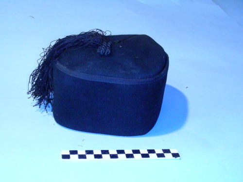Calotta ovoidale con tesa ripiegata e bordata; frangia sulla sommità fissata tramite doppio cordoncino intrecciato. Rivestimento interno di colore bianco. Tessuto di colore nero.