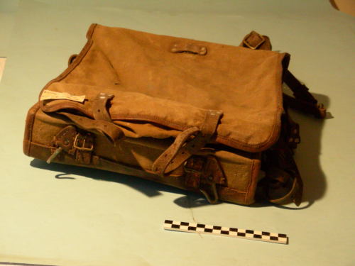 Di forma rettangolare, affusto rigido ricoperto da tela, chiusura a ribalta con due cinturini fissati da tre rivertti ciascuno da fissare a due fibbie cucite alla base. Sulla ribalta applicato un passante fissato con quattro rivetti sulla parte alta ed una fibbia fissata con due rivetti nella parte bassa che accolgono un cinturino d'affardellamento fissato ad una maglietta sul lato superiore. Due ganci cuciti alla base per accogliere gli spallacci inseriti sul dorso entro un rivestimento di cuoio fissato al corpo con otto rivetti di dimensioni diverse. Sui due lati longitudinali sono applicati rispettivamente due passanti per accogliere delle cinghie d'affardellamento di misure diverse con chiusura a fibbia. Sotto la ribalta due patte di chiusura contrapposte, con due cinturini di chiusura fissati con due rivetti sulla parte destra e due fibbie contrapposte fissate con due rivetti, due lunghi passanti di cuoio trattengono i due cinturini. All'interno della ribalta è stata ricavata una tasca con due lembi di chiusura sovrapposti con cinturino di chiusura fissato con due rivetti e sottostante fibbia fissata con sei rivetti. All'interno, sul rinforzo superiore nella parte interna sono fissati due ganci di fermo snodabili ed un elemento a "L" con foro.