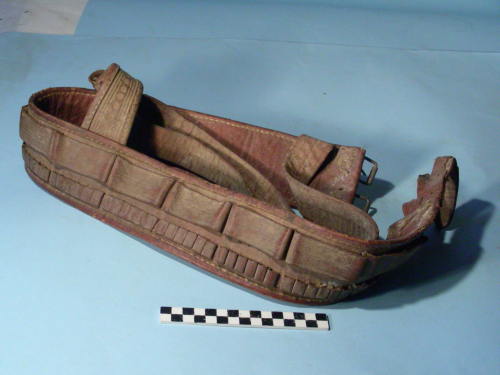 Cinturone terminante con 2 fibbie a sinistra e 2 cinturini a destra. Sulla parte superiore sono stati cuciti 12 passanti per l'inserimento dei caricatori; sotto ogni passante sono stati inseriti 6 celle per l'nserimento della parte terminale dei proiettili. E' presente lo spallaccio decorato a motivi floreali divisa in due parti con fibbia e cinturino per il fissaggio.