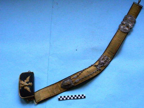 Larga fascia in tessuto dorato, al verso di velluto nero, con importante stemma in rilievo applicato al centro e terminante con due magliette e moschettoni dorati per il fissaggio agli anelli di una gibernetta. Grande fibbia metallica per la regolazione in tre parti, una doppia valva, un passante ed una valva singola, il tutto decorato a motivi floreali in rilievo. Gibernetta a forma di parallelepipedo nero con profilature e facce laterali dorate; chiusura a ribalta tramite asola ad incastro in un perno fissato alla base. Stemma in rilievo applicato al centro della ribalta.