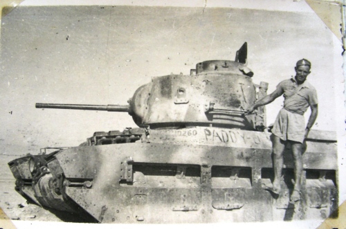 In bianco e nero ritrae un carro armato inglese Matilda immobilizzato con un soldato italiano, con uniforme del deserto, in piedi sul carro attaccato ad una maniglione.