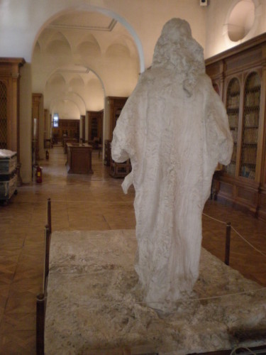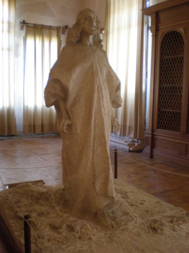 - NOTIZIE STORICO CRITICHE Il bronzo, da cui fu tratto questo calco in gesso, venne commissionato all'artista dal suo amico, il Conte Camerini, verso la fine del 1895. La statua fu inaugurata il 23 settembre 1901. In collezione privata torinese si conserva il bozzetto in terracotta (Bernini, in cat. mostra 1984, p. 75). Come annotato da Lia Bernini (1984, p. 76), "Il Cristo che cammina sulle acque" deriva direttamente dal Cristo della "Salita al Calvario" della Cappella di Crea, eseguita tra il 1892 e il 1895, con lo stesso abito "a sacco" e la medesima, ricercata, teatralità. Questo Redentore, al suo apparire, "divise i critici in due campi: chi favorevole, che riconobbe in esso una rappresentazione delle inquietudini religiose moderne, un Cristo quasi «socialista» che «va incontro ad un popolo a morire per un'idea»; chi, invece, lo condannò per la sua teatralità e spinto estetismo" (Bernini 1984, p. 76). A ogni modo, a colpire maggiormente la critica fu l'abbandono dell'icona di "un Cristo mite e semplice e la sua sostituzione con un'immagine moderna di un Cristo che compendia nel suo volto le nuove teorie di Marx e Nietzsche" (Id.) In una lettera scritta da Piazzola sul Brenta al poeta Giovanni Pascoli (21 ottobre 1905), lo scultore sembra alludere alla discussa vicenda critica: "Siamo passati di qui per rivedere il mio «Cristo» che il conte Camerini ha idealmente collocato sopra un'isola nel quieto e solitario lago di un parco. Come vorrei che voi foste con me di fronte a quest'umile certo, ma profonda e dolorosa opera del mio cuore!" (Migliorini, 1992, p. 60). Era questa un'opera che lo scultore piemontese amava particolarmente "perché riteneva, forse, di essere riuscito a realizzare la tanto vagheggiata trascrizione dal divino all'umano e a trasformare l'idea e il sogno in materia" (Migliorini, 1992, p. 29). Oltre al modello di Rodin, l'opera, secondo Migliorini (1992, p. 104) risentirebbe della lettura di alcune pagine del Bel Ami di Guy de Maupassant e della fortuna che a seguito di queste ebbe l'omonimo Cristo che cammina sulle acque di Michael Munkacsy del 1881.