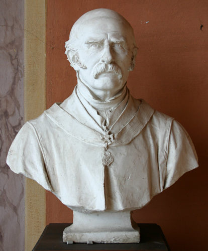 - NOTIZIE STORICO CRITICHE Ceccon eseguì nello stesso anno questo busto del duca Silvestro Camerini e quello della sua sposa Eurosia Mantovani. Il "capostipite" della famiglia Camerini acquisì il complesso di villa Contarini nel 1852 dai Correr-Giovanelli. Di modestissime origini, Silvestro nacque a Castel Bolognese nel 1777. Nell'arco di una vita egli seppe costruire una vera e propria fortuna ecomonica, il cui inizio coincise con il trasferimento della famiglia a Ferrara. Camerini iniziò con l'assumere lavoratori giornalieri per l'ottenimento di appalti, sempre più ingenti, relativi alla costruzione e riparazione degli argini dei fiumi. Contestualmente iniziò un lucroso commercio della sabbia e della ghiaia ricavata dai fiumi nei quali si ponevano le arginature. Nel 1825 ottenne l'importante appalto per la costruzione e consolidamento di tutte le strade nazionali dello Stato Pontificio. Nel tempo la sua fortuna crebbe al di qua e al di là del fiume Po, ed egli accumulò possedimenti tanto nel Regno Lombardo-Veneto quanto nello Stato Pontificio. Contestualmente si distinse in numerosi atti di beneficenza, quali ad esempio l'importante finanziamento effettuato nel 1823 per il restauro della Basilica di San Paolo fuori le Mura a Roma, distrutta da un incendio (Cfr. G. Doro, Da bracciante a Duca: Silvestro Camerini appaltatore, esattore e proprietario nel Veneto dellOttocento, Tesi di laurea, Rel. Prof. A. Ventura, Facoltà di Lettere e Filosofia, Università degli Studi di Padova, a.a. 1989-1990). Nel 1846, poche settimane dopo l'elezione al soglio pontificio, Pio IX, che conosceva da tempo Camerini e la sua attività filantropica, gli conferì la Croce di Commendatore Cavaliere. Nel busto in esame, dalla posa e dall'abbigliamento severo, Ceccon, pur nella semplicità dell'abito, pone in risalto tale onorificenza, indangando vieppiù lo sguardo sicuro e penetrante del vecchio duca.