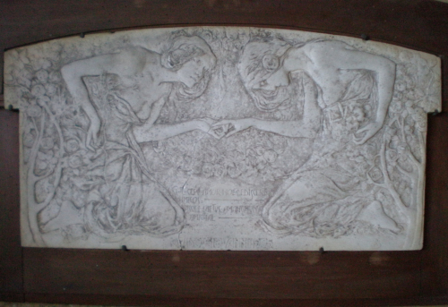 - NOTIZIE STORICO CRITICHE L'opera, segnalata con il titolo L'Amicizia e l'Amore nella Guida del 1926 è il calco in gesso del bronzo un tempo visibile in villa nella Sala delle Villeggiature (Guida 1926, p. 29), oggi sfortunatamente non più rintracciabile. Di questa targa, la Gipsoteca Bistolfi di Casale Monferrato conserva il modello in gesso, leggermente più grande (0,43x0,75), e un calco sprovvisto dell'iscrizione dedicatoria (Cfr. Gipsoteca Leonardo Bistolfi 2001, III.30). A testimonianza del largo consenso raggiunto dallo scultore, durante la Biennale veneziana del 1905, gli fu riservata una mostra personale di 21 sculture e alcuni disegni. Dopo essersi recato a Venezia La Biennale veneziana del 1905, insieme alla famiglia, per la celebrazione, Bistolfi sulla via del ritorno decise di fermarsi a Piazzola sul Brenta per rivedere il suo Cristo sulle acque. E' pensabile quindi che la presente targa, datata 1905, sia stata acquisita in quell'occassione da Paolo Camerini. Stilisticamente l'opera aderisce al gusto liberty allora dominante, in un'estenuata accezione spiritualista, che avviluppa le figure entro racemi rosati. Tutta la poesia è racchiusa in quel tanto di sublime indolenza che muove le mani delle due giovani fino al congiungimento.