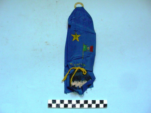 Di colore azzurro, piegato e cucito a metà della lunghezza entro un anello. Nella parte anteriore sono stati dipinti una stella a cinque punte di colore giallo, una bandiera tricolore con asta e scudo sabaudo gialli. Ad un terzo della lunghezza è stato inserito ed annodato un fiocco dorato sovrastante un'area su cui era stato incollato forse un foglio di calendario.