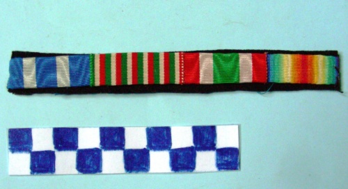 Su panno nero, cuciti su cartone 1) nastro di tre bande azzurre intervallate da due bianche di minor dimensione per croce al merito di guerra, 2) nastro col tricolore italiano verticale ripetuto sei volte per medaglia della guerra per l'unità d'Italia, 3) nastro con due bande rosse laterali, due bianche ed una verde più larga al centro per medaglia a ricordo dell'unità d'Italia 1848-1918, 4) nastro con all'estremità due bande blu, due verdi, due bianche, due gialle che sfumano al centro in una banda rossa per medaglia interalleata della vittoria.