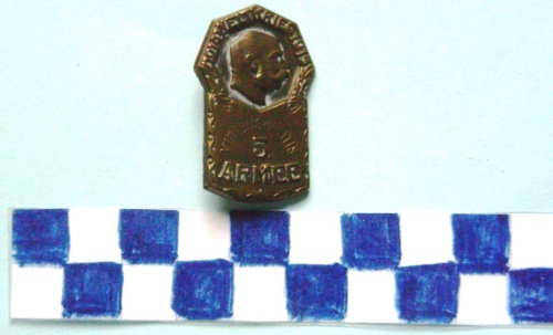 Di forma ottagonale su base rettangolare. Nell'ottagono, in rilievo, profilo a destra di Francesco Giuseppe contornato da iscrizione. Ulteriore iscrizione nella parte ottagonale. Sul verso spilla di fissaggio ed iscrizione.